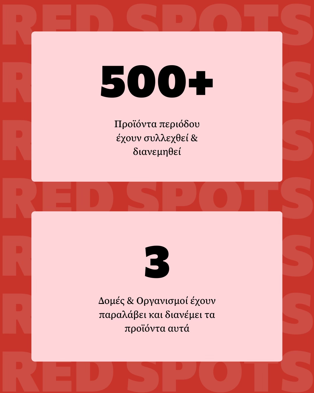 Τα Red Spots 🩸 είναι η νέα πρωτοβουλία του Οργανισμού H3RS, και έχουμε έναν σπουδαίο σκοπό: να διευκολύνουμε τη συλλογή προϊόντων περιόδου, τα οποία θα διανεμηθούν σε Οργανισμούς και δομές που τα χρειάζονται άμεσα. Μέχρι σήμερα, έχουμε καταφέρει να συγκεντρώσουμε και να διανείμουμε πάνω από 500 προϊόντα, χάρη στη στήριξη όλων σας! 😁